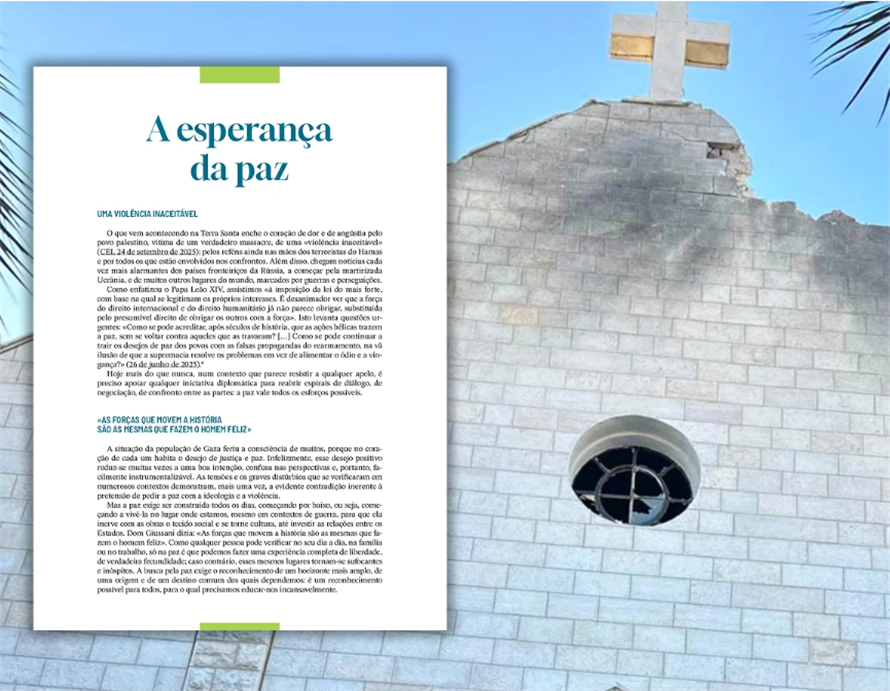 A oração é a primeira resposta indicada pelo Santo Padre, que nos convida a rezar o Terço pela paz todos os dias durante o mês de outubro e a «fazer de cada notícia e imagem trágica que nos atinge um clamor de intercessão a Deus», que é Pai de todos e, por isso, nos torna irmãos e irmãs. A oração converte os corações e abre à esperança. Por isso, Comunhão e Libertação aderiu à vigília de 22 de setembro com outros movimentos e comunidades eclesiais e participará com eles na oração do Terço que o Pontífice conduzirá na Praça de São Pedro, no dia 11 de outubro.
